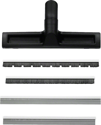- Inserts include a rubber lip for water surfaces, a brush for smooth surfaces and a plastic head for carpets