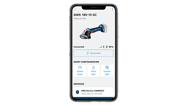A smartphone displays a Bosch Professional angle grinder and settings.