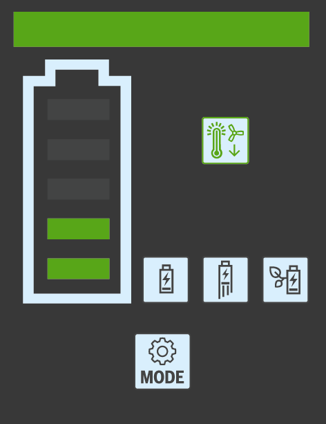 The Active Air Cooling indicator (4) lights up green, the status indicator (3) lights up green and all bars of the battery charge indicator (9) light up green.