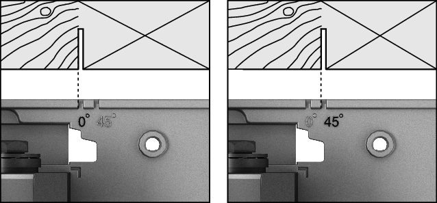 The 0° cut mark (8) indicates the position of the saw blade when making a right-angled cut. The 45° cut mark (9) indicates the position of the saw blade when making a 45° cut.